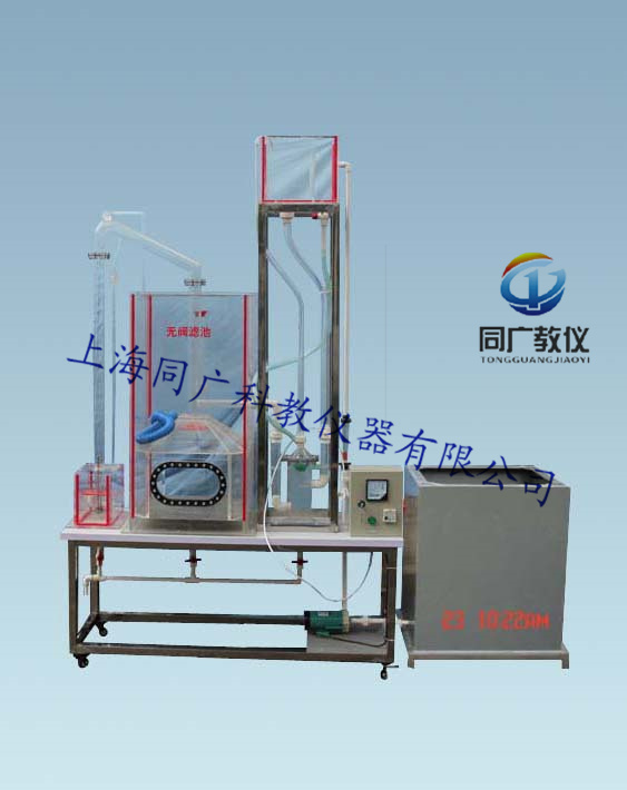 1、无阀滤池1套:透明有机玻璃材质、厚度10mm,含池体、进水槽、进水管、虹吸上升管、顶盖、档板、滤料层、承托层、配水系统、连通渠、冲洗水箱、出水管、虹吸辅助管、抽气管、虹吸下降管、水封井、虹吸破坏斗、虹吸破坏管、有机玻璃池1只、反冲洗虹吸管1套、强制虹吸器1套、强制冲洗器1套、反冲洗出水井1只、反冲洗三角调节器1只、进水气水分流器1只、进水高位水箱及自动反冲洗装置1套、进水回气管1根、过滤出水管1根;